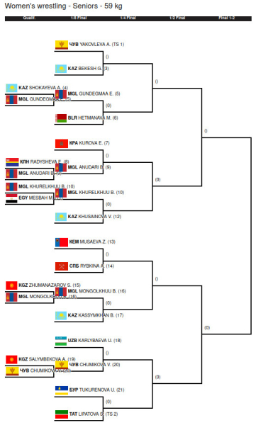 На сайте Федерации борьбы России опубликованы сетки турнира в режиме онлайн. В сетке весовой категории до 59 кг сообщается, что спортсменка из Монголии вышла в 1/8 финала.