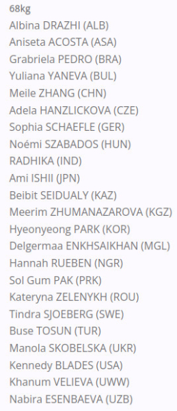 Жуманазарова выступит в весовой категории до 68 кг, где всего заявлены 23 спортсменки, среди которых первый номер мирового рейтинга из Турции, финалистка Олимпиады в Париже (до 76 кг) из США, финалистка чемпионата мира 2023 года из Монголии.