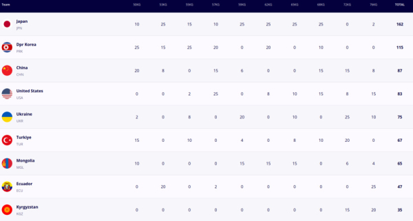 В командном зачете сборная Кыргызстана набрала 35 очков и заняла 9 место среди 50 команд.