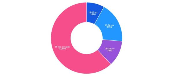 По возрасту наибольшую долю составляют лица 29 лет и старше — 62% (12 555 человек) от общего числа. В возрасте 18-24 лет преступления совершили 3 715 человек, а в возрасте 25-28 — 2 357. Среди подростков 14-17 лет выявлено 1640 человек.