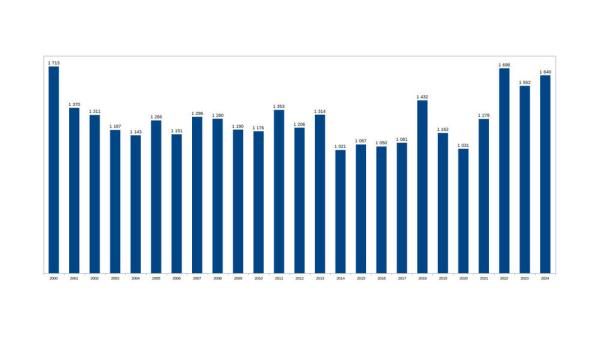Наименьший показатель за последние десять лет был зафиксирован в 2020 году — 1 031.