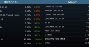 Компания Valve опубликовала мартовский отчёт с анализом предпочтений пользователей сервиса доставки игр Steam. Доля активных пользователей Steam, использующих платформу Linux, достигла значения в 5.33%, что в 2 раза больше, чем было отражено в предыдущем месяце. С учётом того, что число активных пользователей Steam оценивается в 132 миллиона, 5.33% соответствует примерно 7 миллионам пользователей. В февральском отчёте данный показатель составлял 2.23%, ...