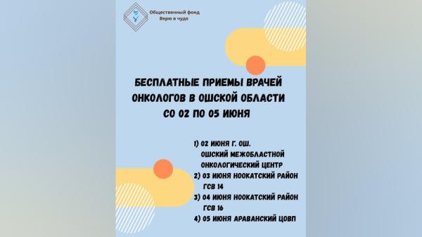 • 2 июня — город Ош, Ошский межобластной онкологический центр