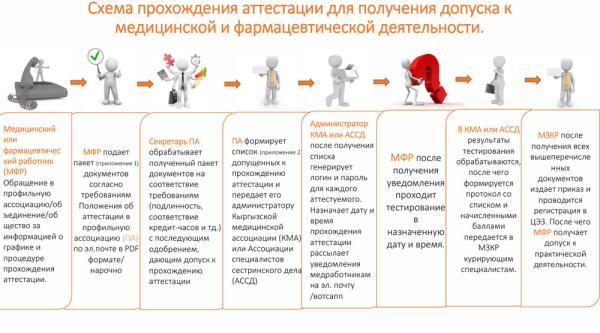 Аттестация специалистов направлена на определение уровня их профессиональной подготовки, компетентности, способности выполнять служебные обязанности в соответствии с занимаемой должностью и с последующим присвоением квалификационных категорий. Аттестации подлежат специалисты, осуществляющие трудовую деятельность в организациях здравоохранения Кыргызской Республики, независимо от формы собственности и ведомственной принадлежности, в том числе лица, занимающиеся частной медицинской и фармацевтической деятельностью.