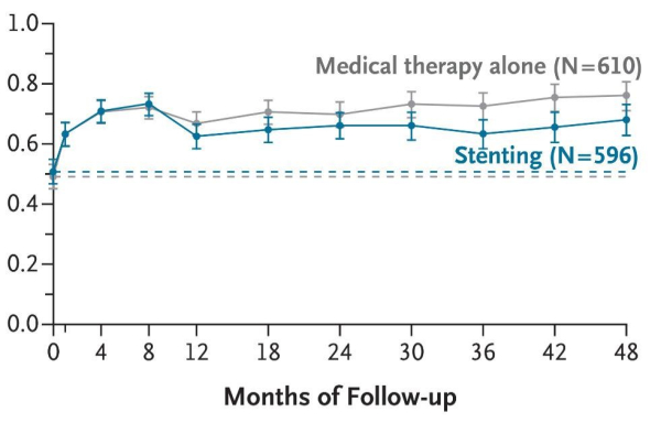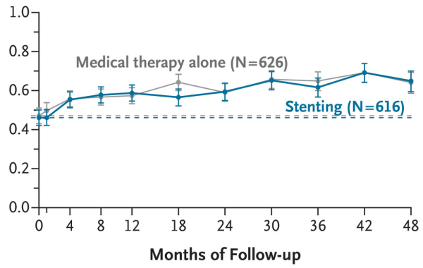 Исследование CREST-2 включало в себя два параллельных исследования, в которых все пациенты получали интенсивное медикаментозное лечение. Одно исследование, в котором 1245 пациентов были случайным образом распределены для проведения стентирования или только интенсивного медикаментозного лечения, показало значительную пользу от стентирования. Напротив, в параллельном исследовании, в котором 1240 пациентов были случайным образом распределены для проведения каротидной эндартерэктомии или только интенсивного медикаментозного лечения, существенных различий между группами обнаружено не было.