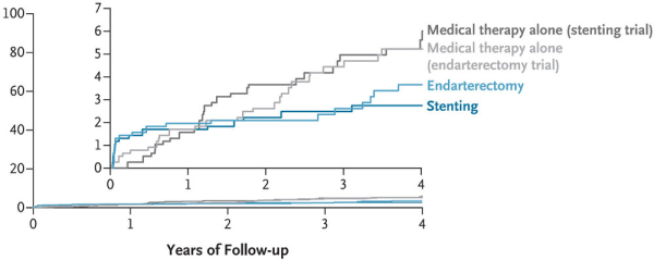 Основные исходы исследования: На графике представлены оценки Каплана–Мейера по частоте развития первичных исходов за 4 года в исследованиях по стентированию и эндартерэктомии в соответствии с группой исследований. Первичным исходом был любой инсульт или смерть, оцененные с момента рандомизации до 44 дней, или ипсилатеральный ишемический инсульт, оцененный в течение оставшегося периода наблюдения до 4 лет.